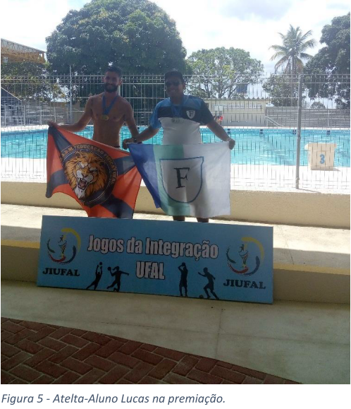 Seguimos nossas trajetórias, veio o dia da natação, em que os alunos-atletas Lucas Alpino e Nelson Nunes foram à piscina e conquistaram as primeiras medalhas da física nos jogos, 04 medalhas de prata nas provas do 400m livre, 100m peito, 50m peito e 50m borboleta.