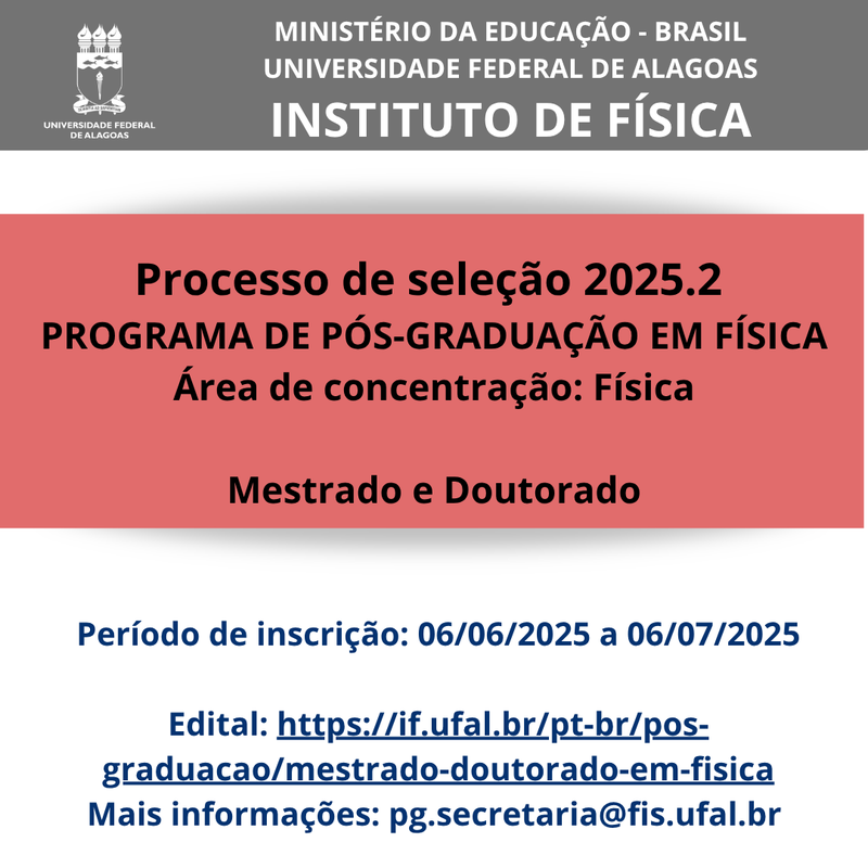 As inscrições se iniciam no dia 06/06/2025, através do Sigaa, e seguem abertas até o dia 06/07/2025. Para maiores informações, pode-se consultar o edital da seleção ou enviar mensagem para pg.secretaria@fis.ufal.br.