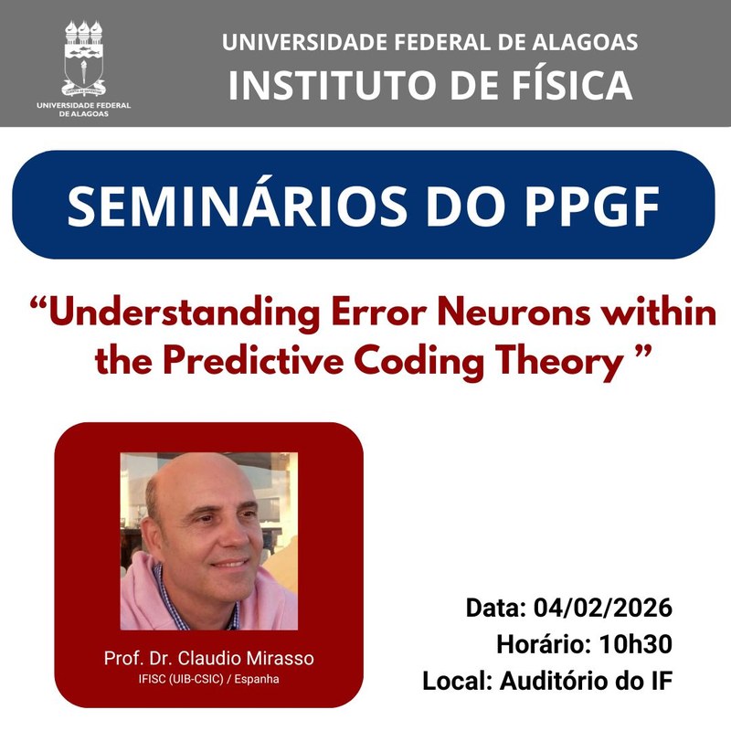 No dia 04/02/65, às 10h30, será apresentado o Seminário "Understanding Error Neurons within the Predictive Coding Theory", pelo Dr. Claudio Mirasso, do Instituto de Física Interdisciplinar y Sistemas Complejos da Universitat Illes Balears. O evento ocorrerá no Auditório do Instituto de Física. Contamos com a participação de todos.